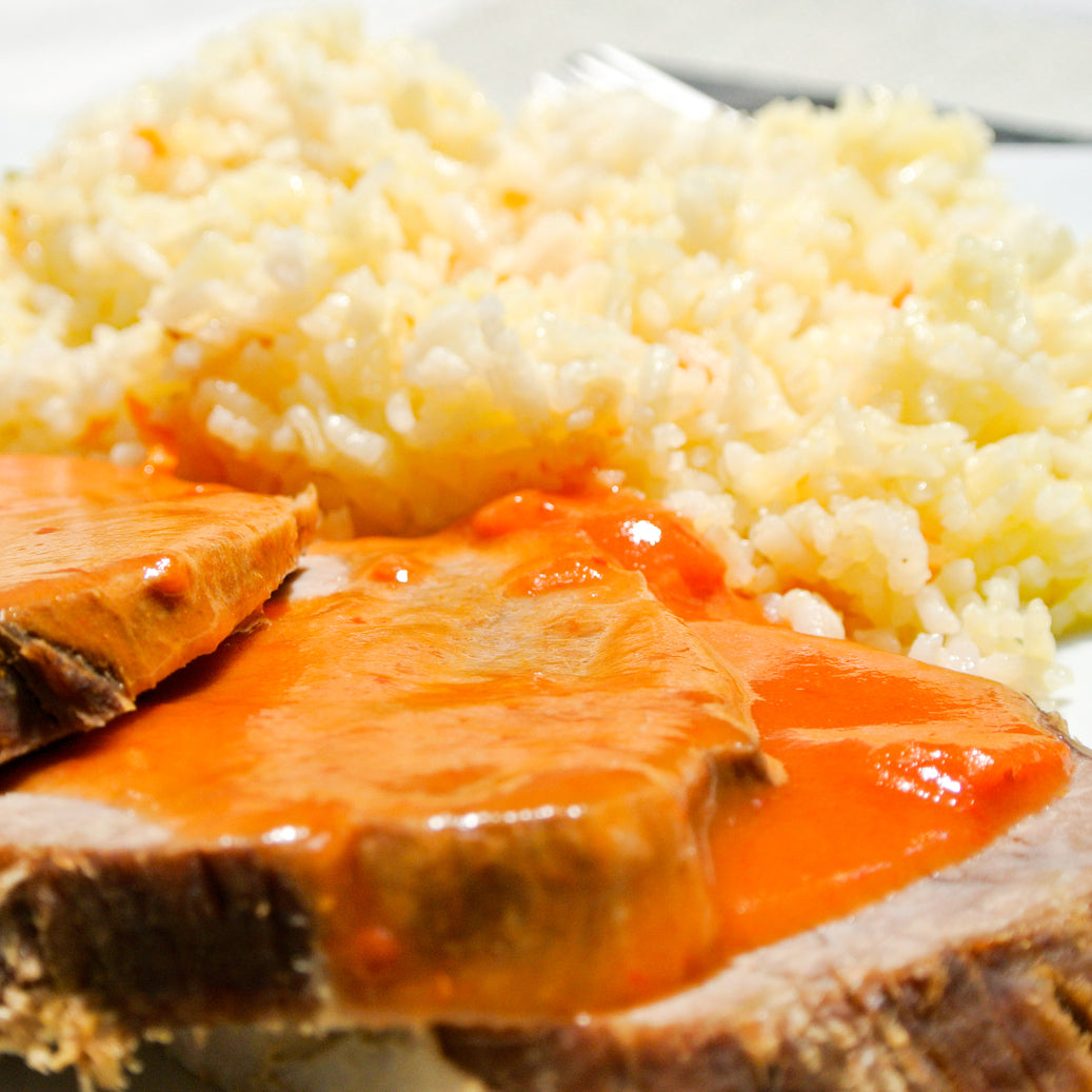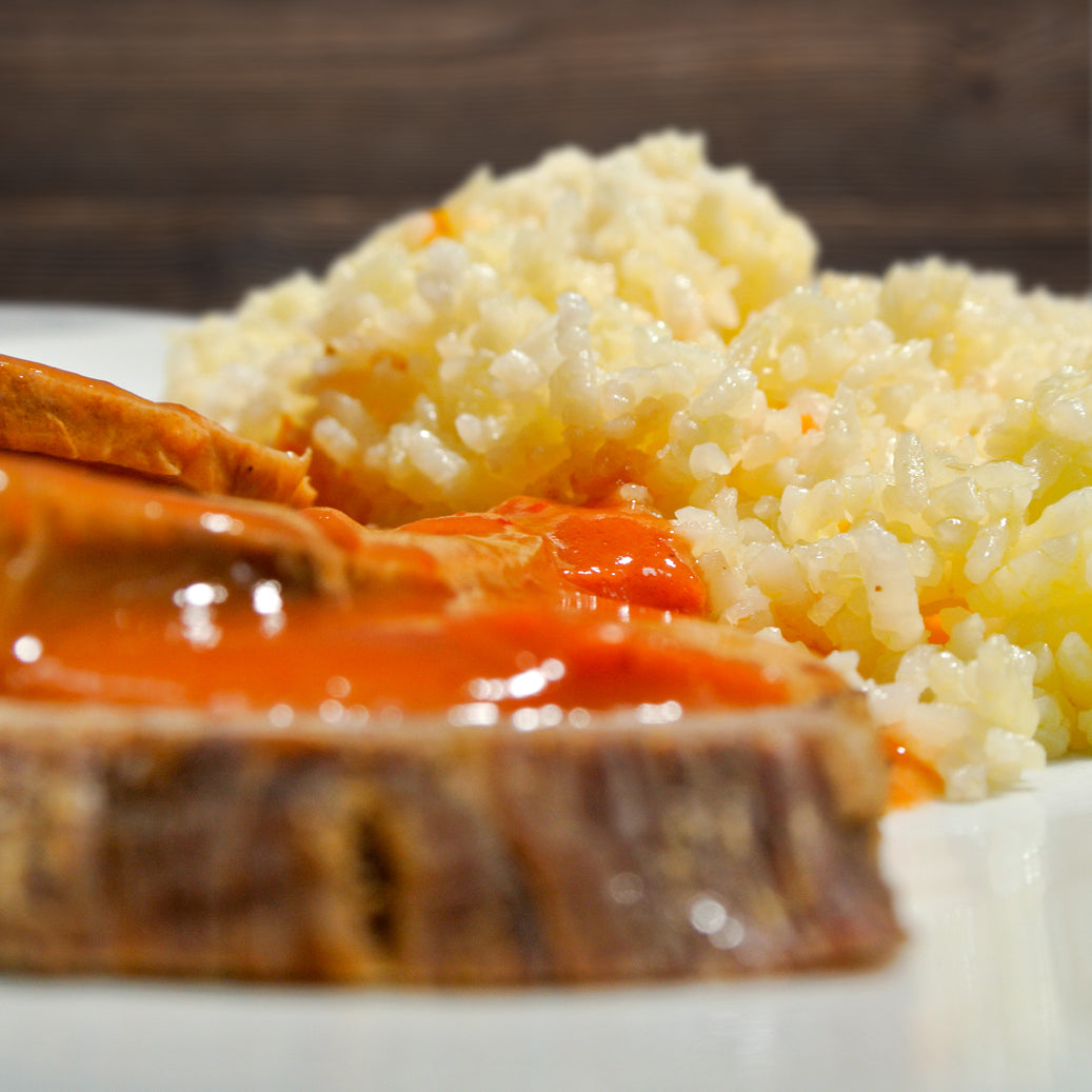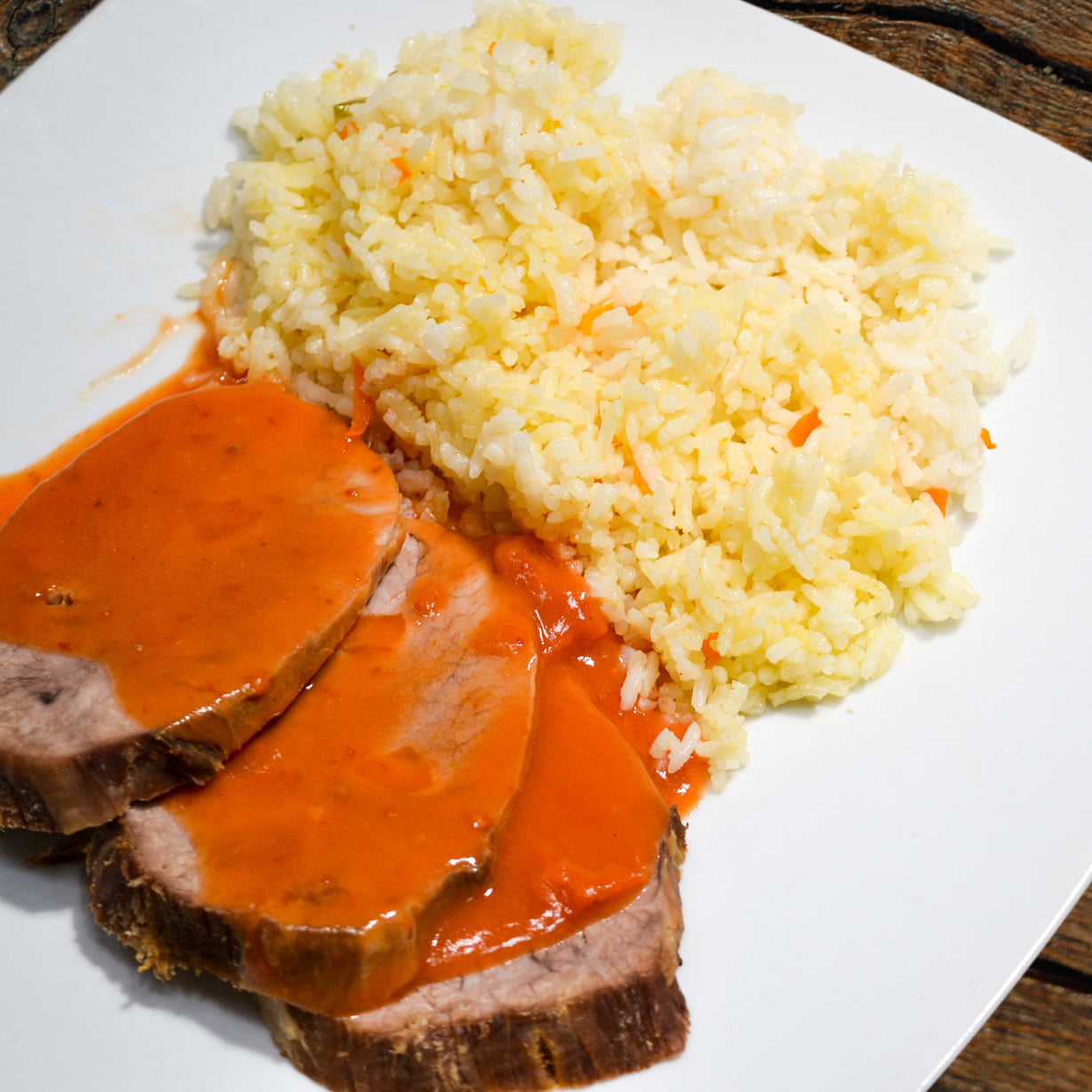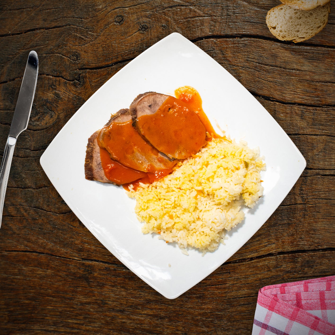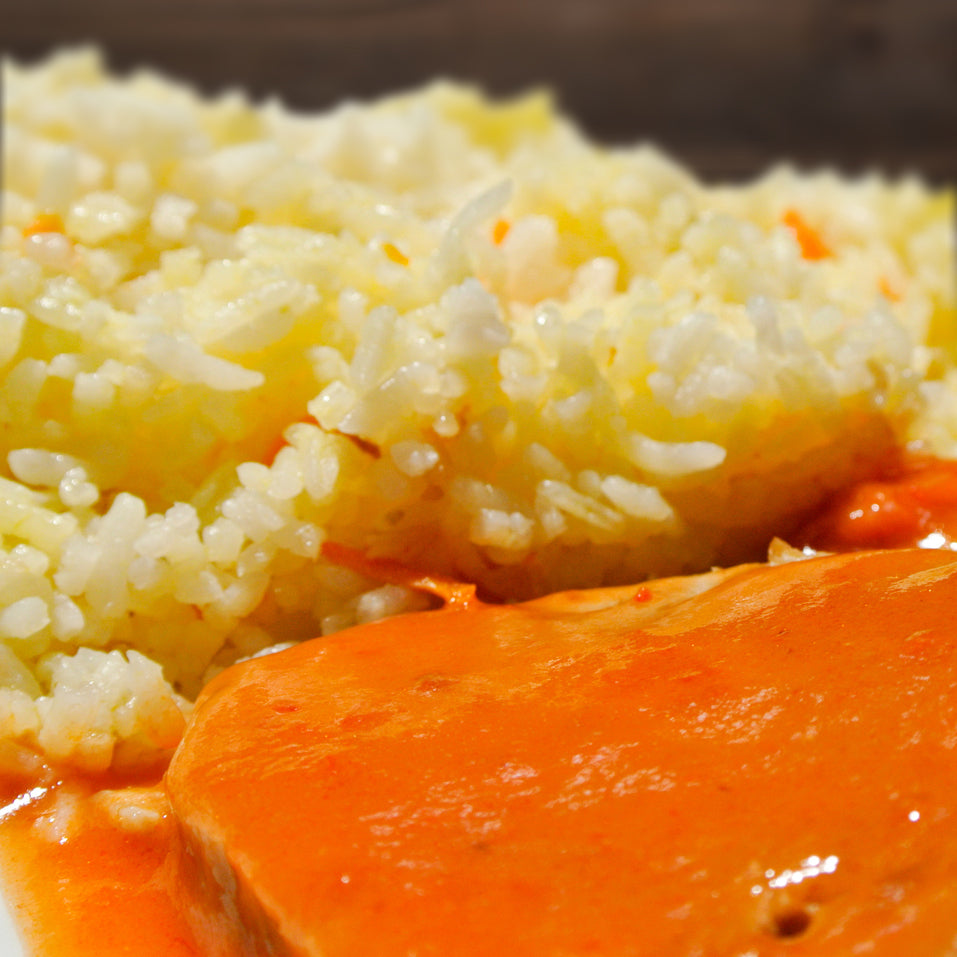 Carne cocida a fuego lento con zanahoria, cebolla, sal, pimienta y pimentón, con una salsa de tomate concentrado y champiñones con arroz blanco Grado 1 y Curry