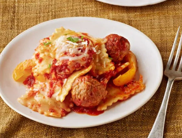 RAVIOLIS CON MINI ALBONDIGAS DE VACUNO CON SALSA DE TOMATE